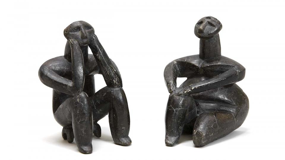 Légende photo : Le penseur et la femme assise. Cernavoda Région de Constanta, Néolitique, Culture Hamangia. Terre cuite – Propriétaire : Musée national d’Histoire de Roumanie