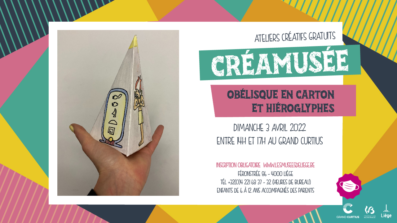 Le Créamusée ‘Obélisque en carton et hiéroglyphes’ est un atelier créatif gratuit, proposé en regard de l’exposition « Les hiéroglyphes avant Champollion » (Liège, Grand Curtius, 4 mars > 22 mai 2022), consacrée à l’interprétation des hiéroglyphes avant le déchiffrement de la pierre de Rosette.